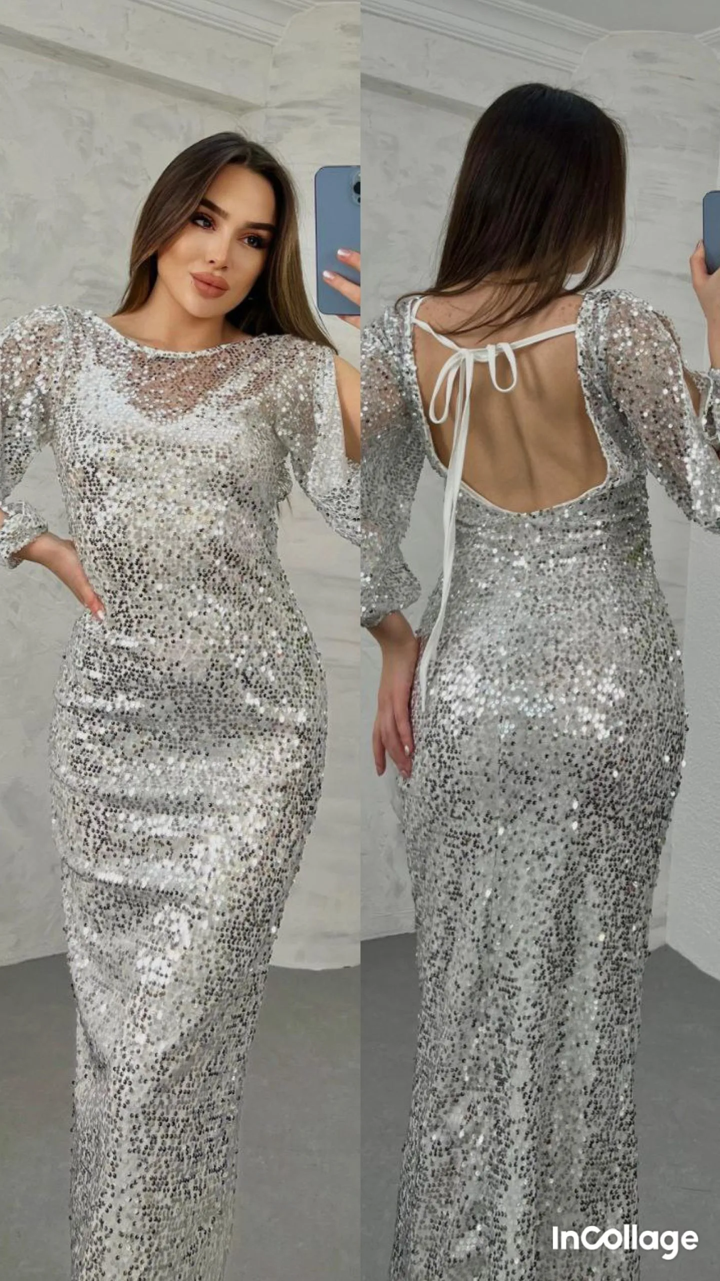 Фустанот е составен од два дела: горен дел кој е целосно покриен со спринки и долен дел кој е полестер со многу ликра. Ракавите се разечени а назад не многу длабок гол грб.