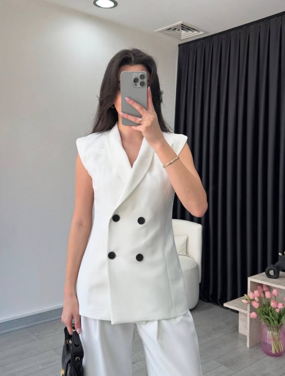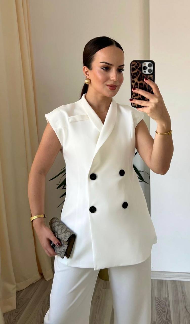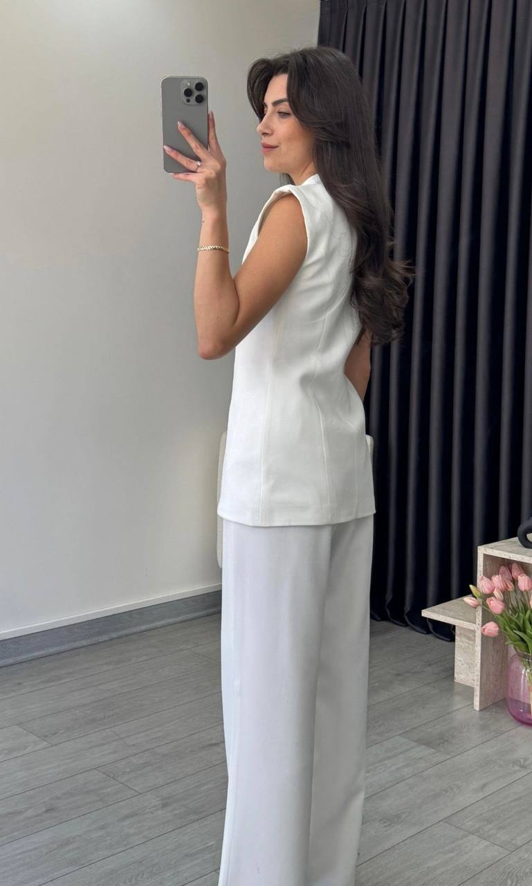 Комплетот е изработен од високо квалитетен материјал памук со ликра. Панталоните се широки надолу, а елекот е со дожина до колк, на елекот има четири црни копчиња и има потстава.