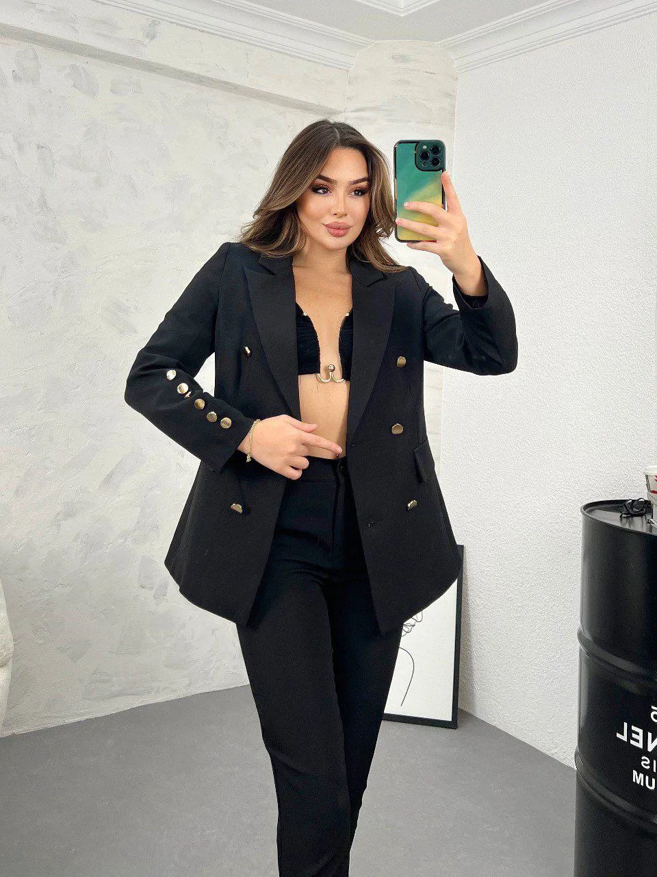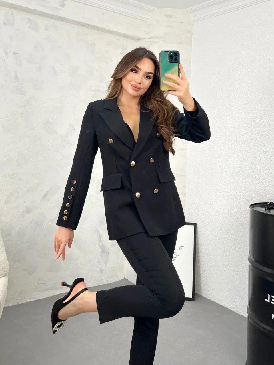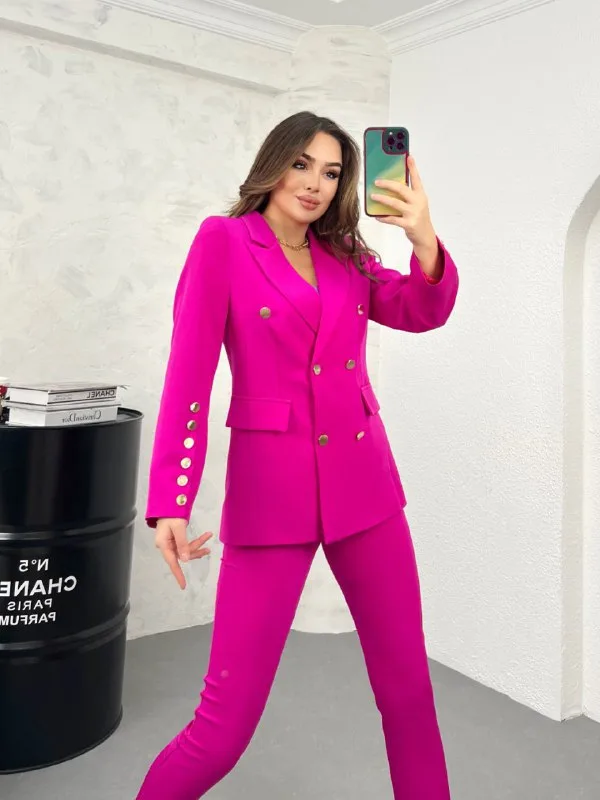 Костумот е изработен од високо квалитет материјал. Сакото е со потстава, на ракавот има шест копчиња. Панталоните се прави со нормален струк и имаат џепови.