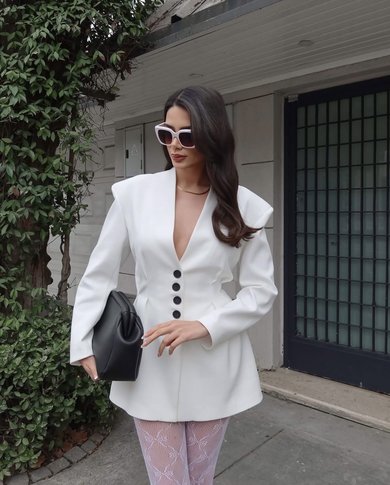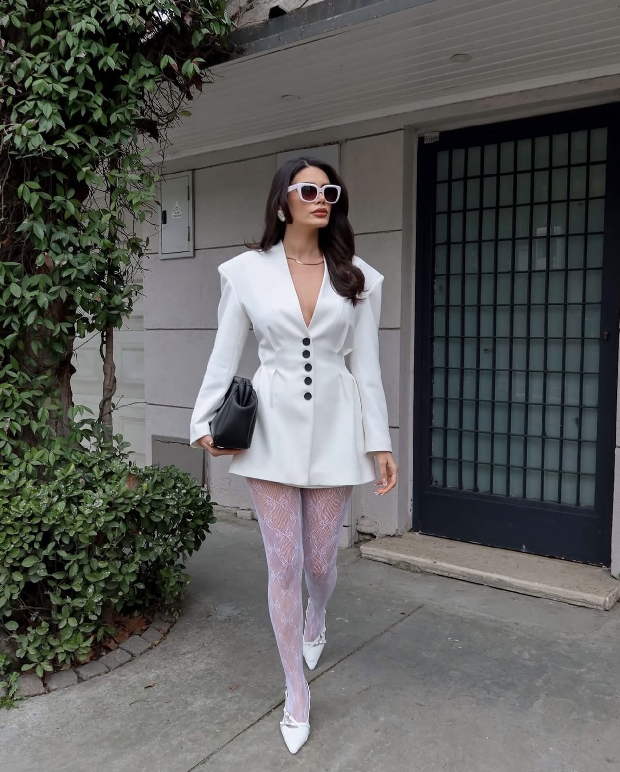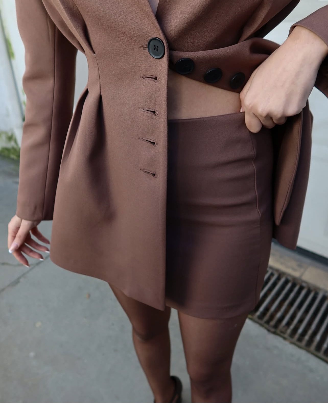 Комплетот е составен од сако и здолниште. Сакото изгледа како фустан во струкот е потесен и има црни копчиња во внатрешната страна има потстава и потпунки. Должината на здолништето е мини.