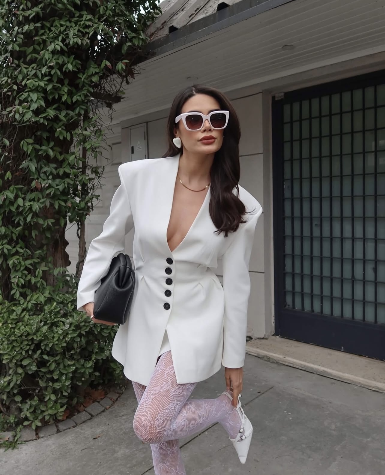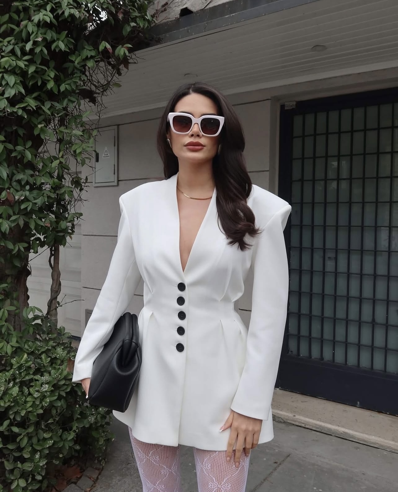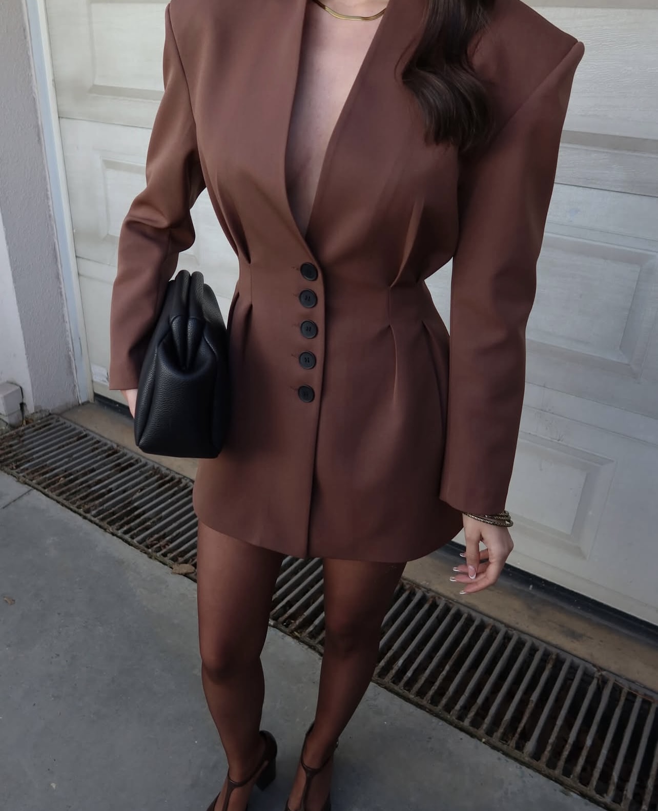 Комплетот е составен од сако и здолниште. Сакото изгледа како фустан во струкот е потесен и има црни копчиња во внатрешната страна има потстава и потпунки. Должината на здолништето е мини.