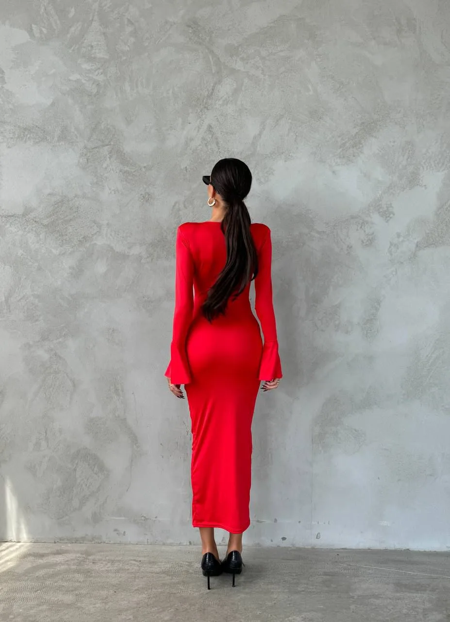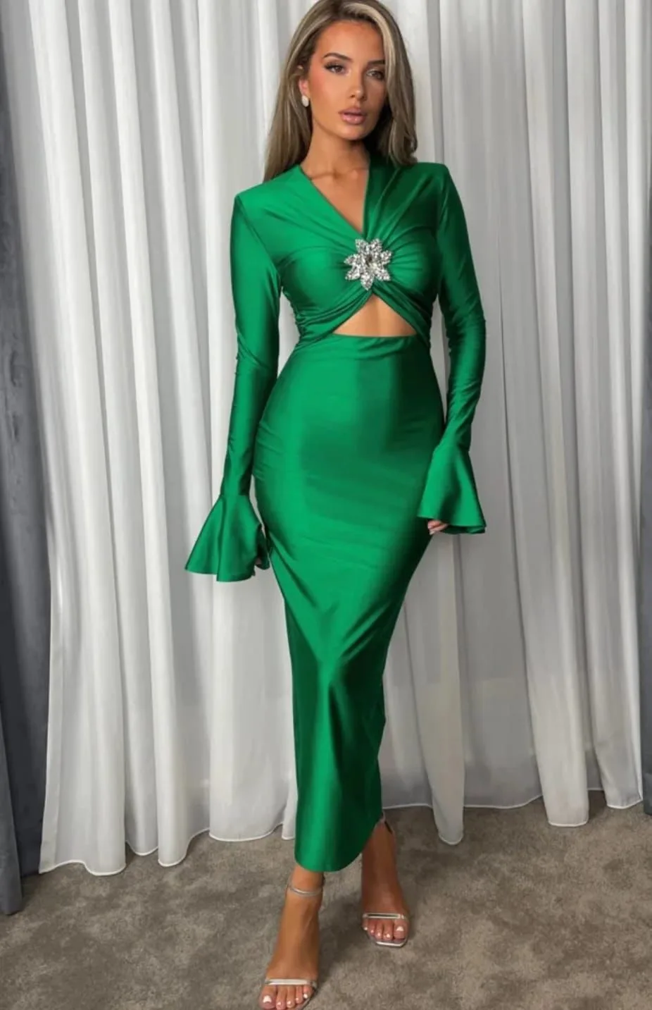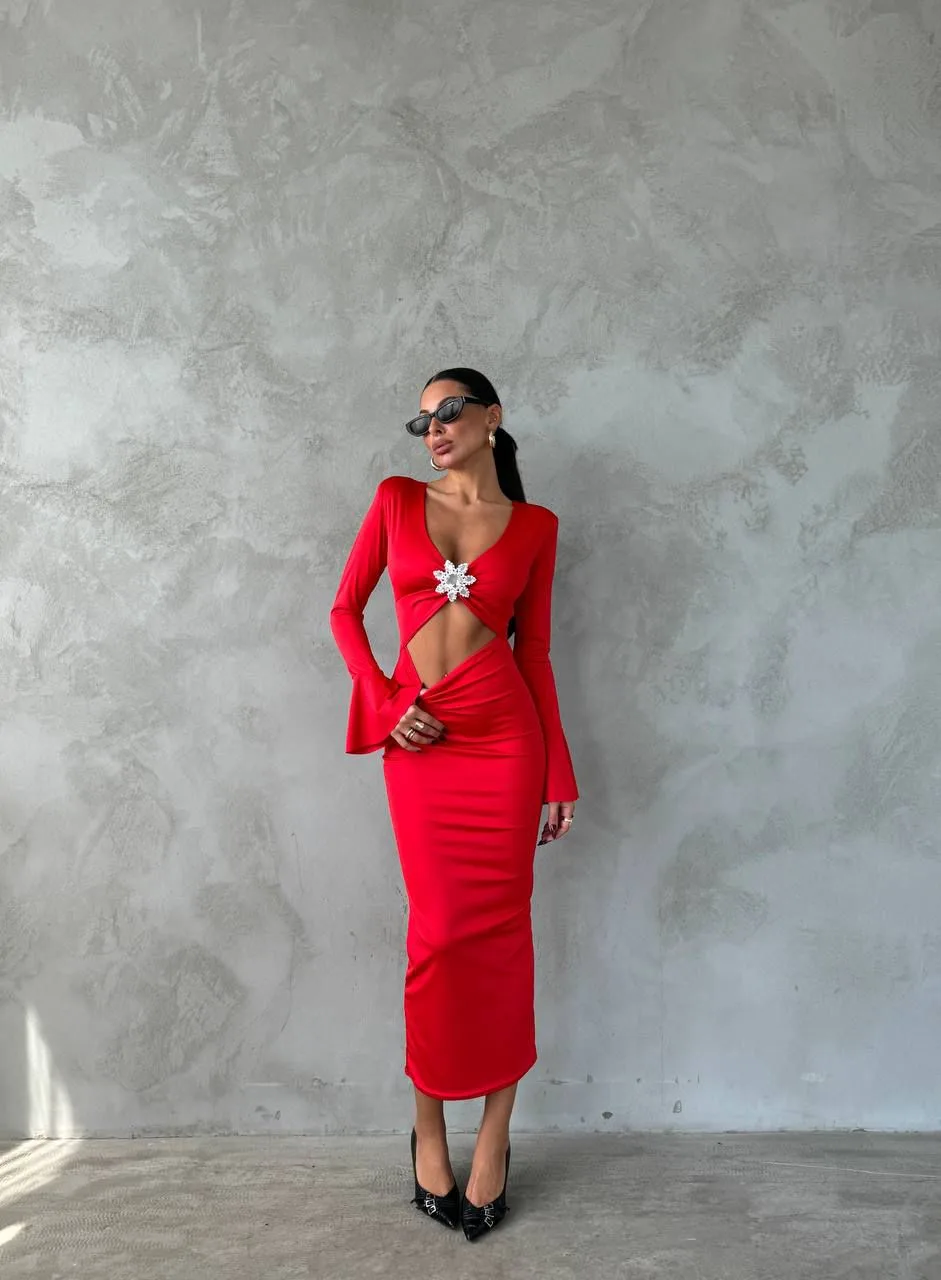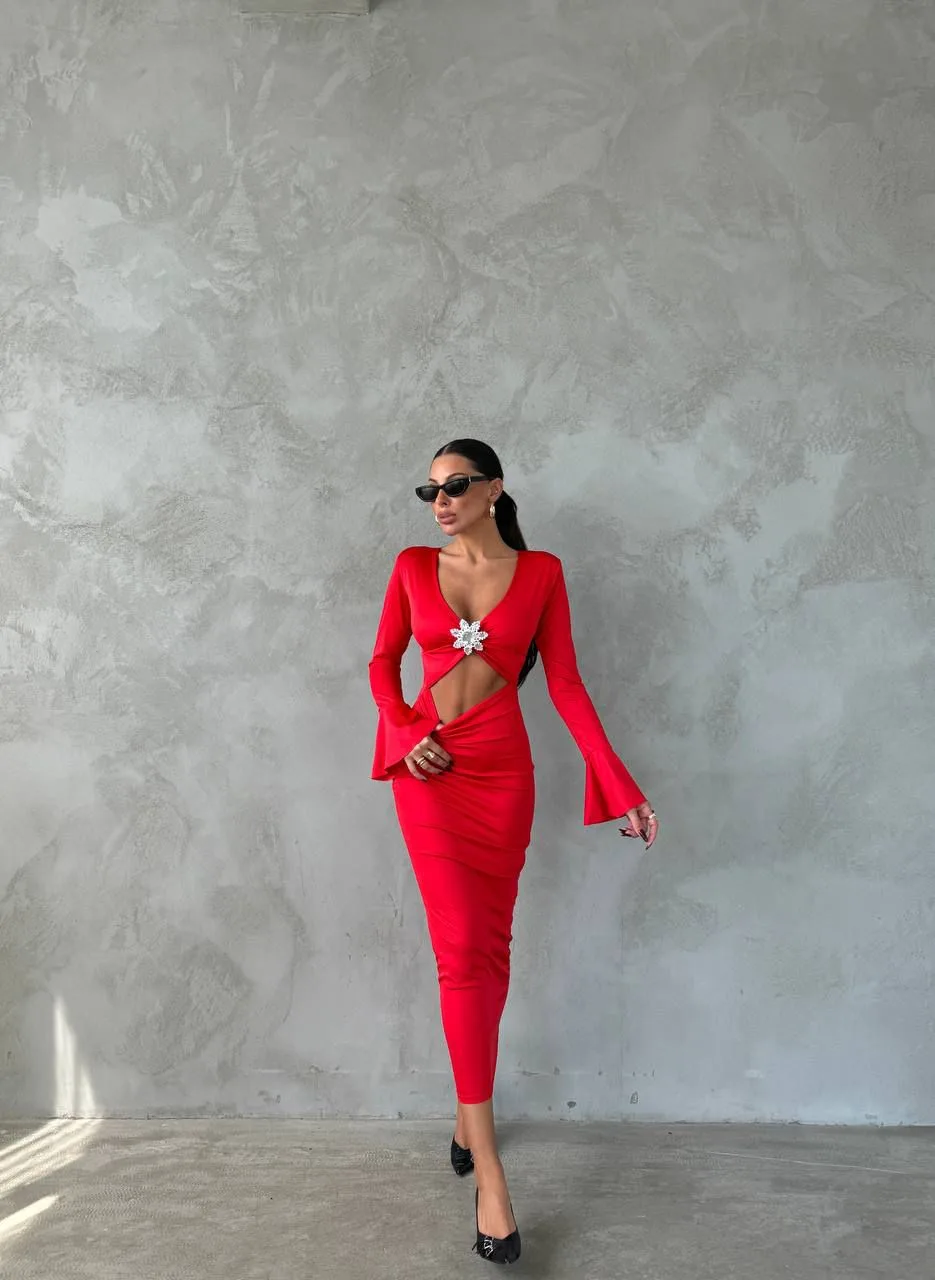 Елегантен миди фустан, кој е отворен во делот под градите. Заедно со фустанот има брош кој му дава посебен изглед на моделот. Ракавите имаат ѕвонест крај.