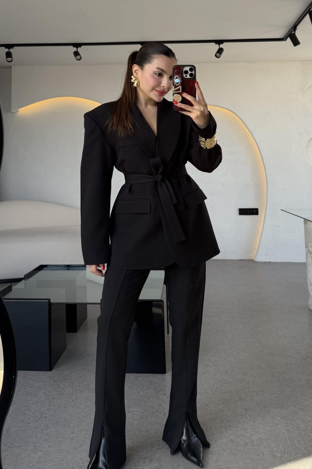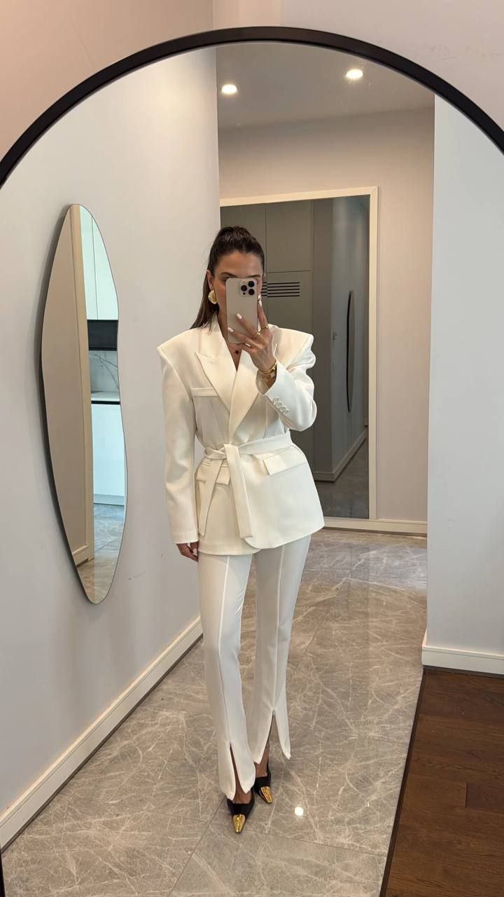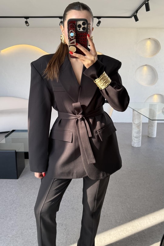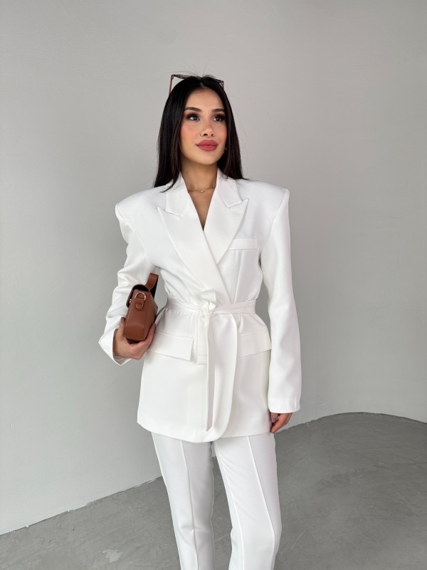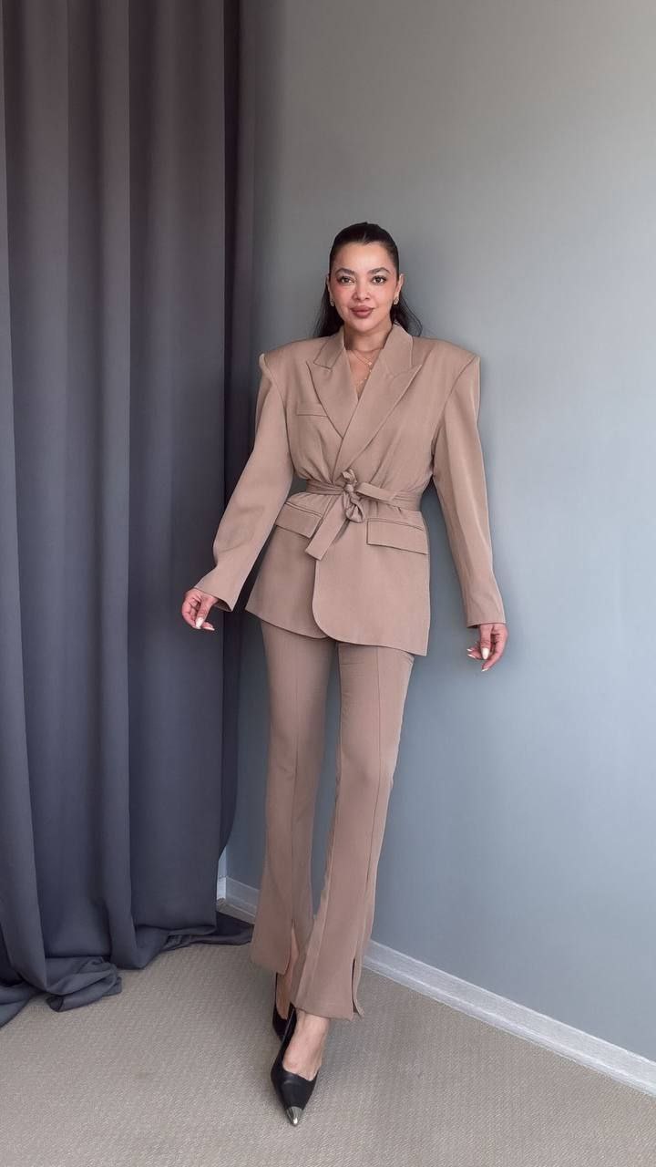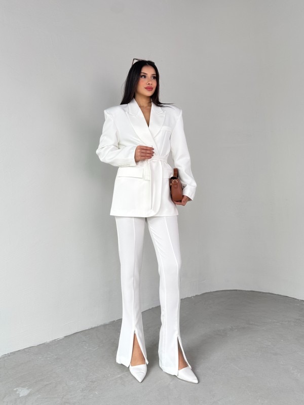 Комплетот е составен од сако и панталони. Сакото е со потпунки и потстава во струкот има колан. Панталоните имаат раб напред кој завршува со отвор.