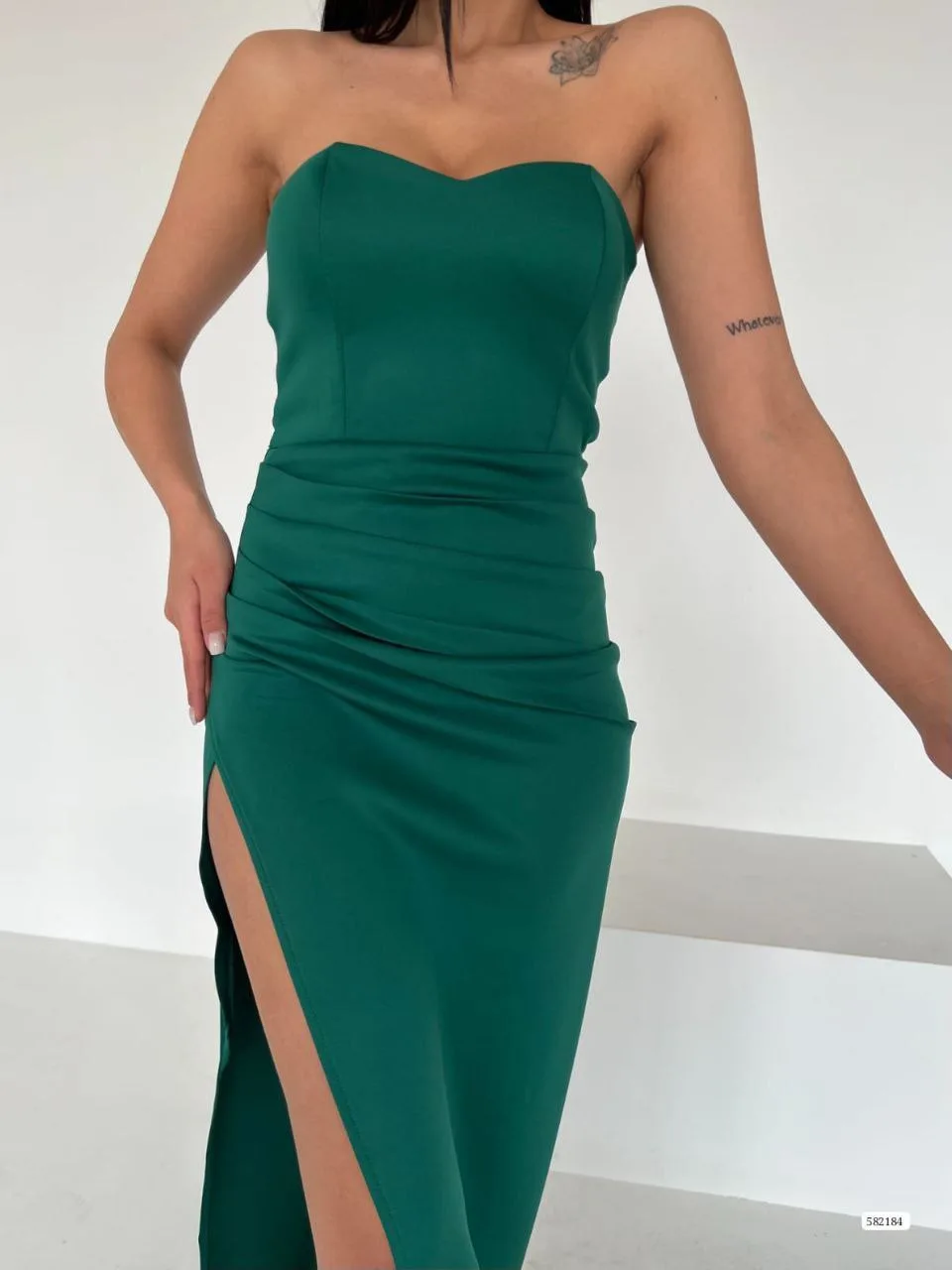 Материјалот на фустанот и памук, полиестер со многу ликра. Во делот на корсетот има потпунки. Фустанот има длабок шлиц што го прави посебен и елегантен моделот.