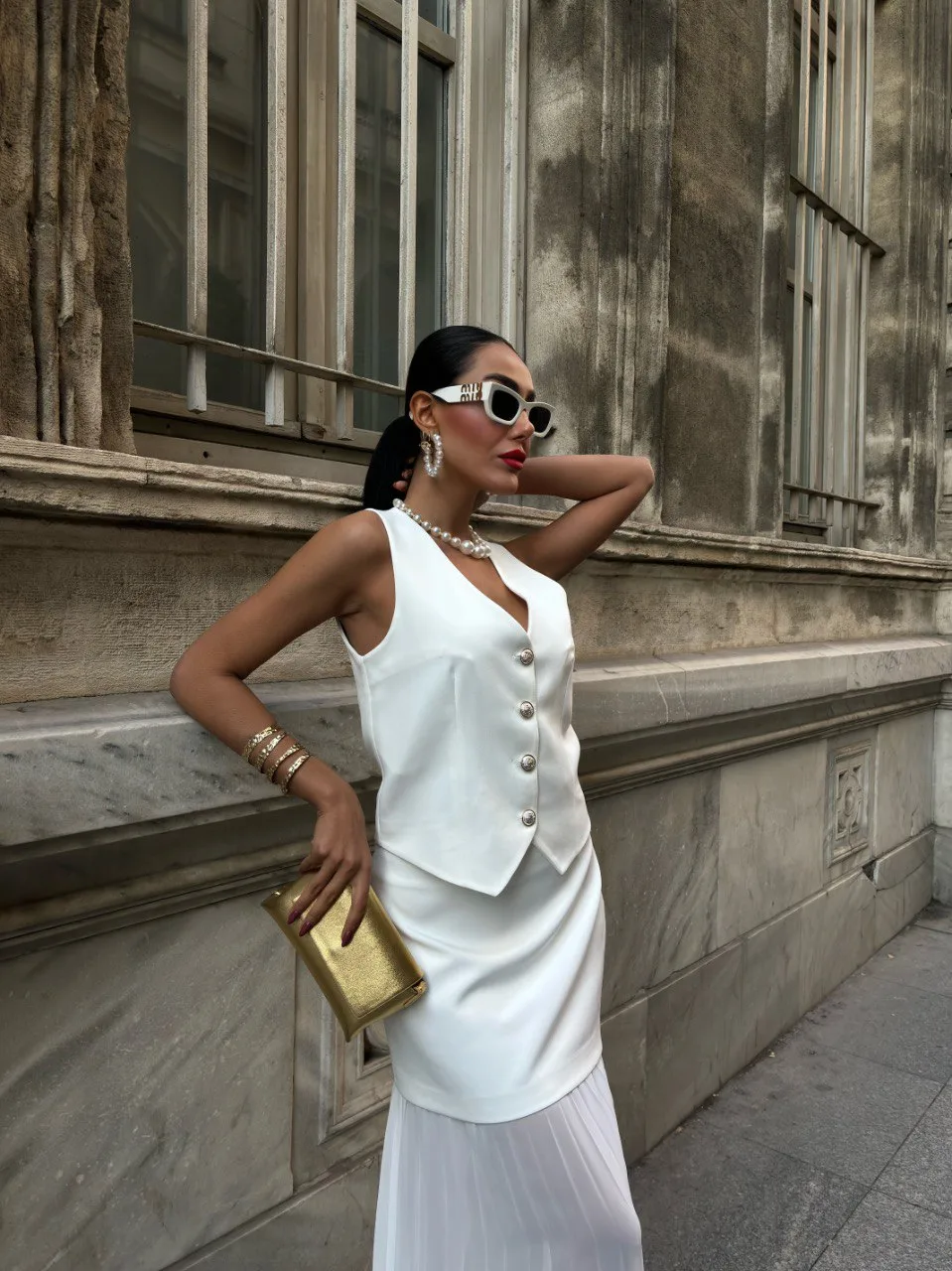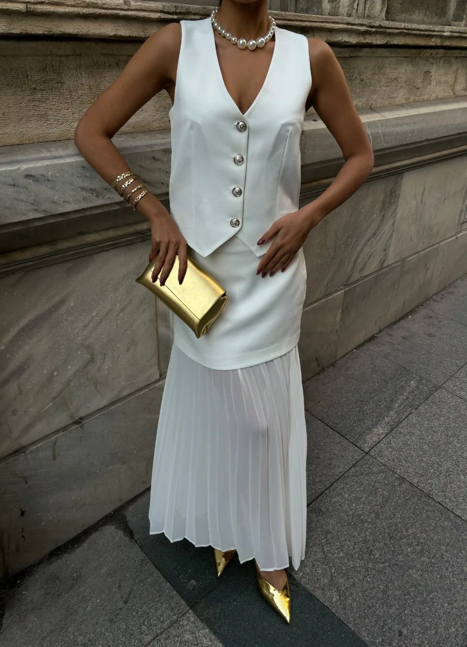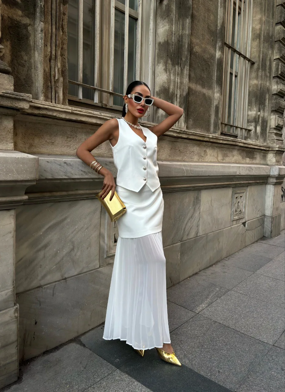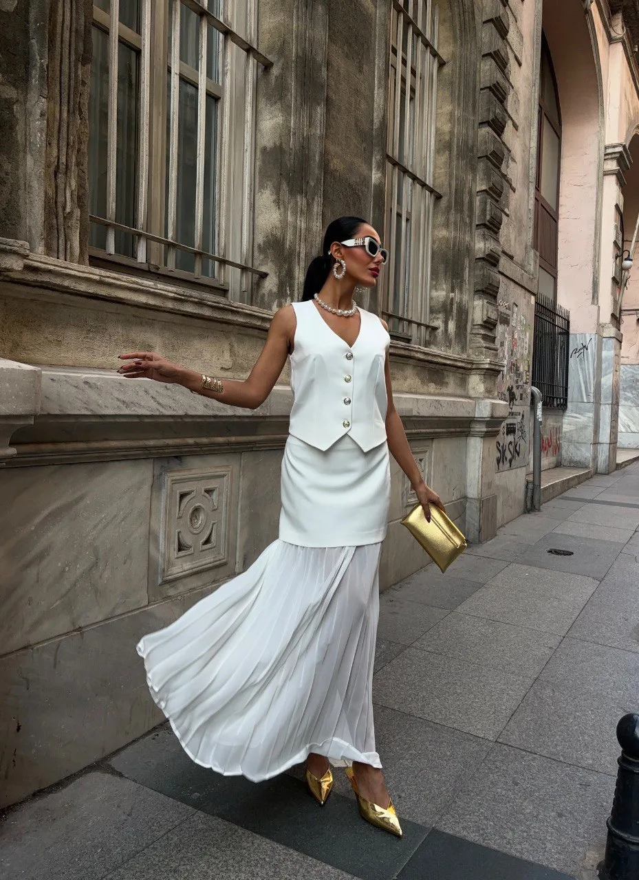 Комплетот е составен од елек и здолниште. Елекот има четири копчиња, има потстава. Здолништето во горниот дел е изработен од памук со ликра, а долниот дел изработен од жоржет кој е плисе со што го прави моделот уникатен.