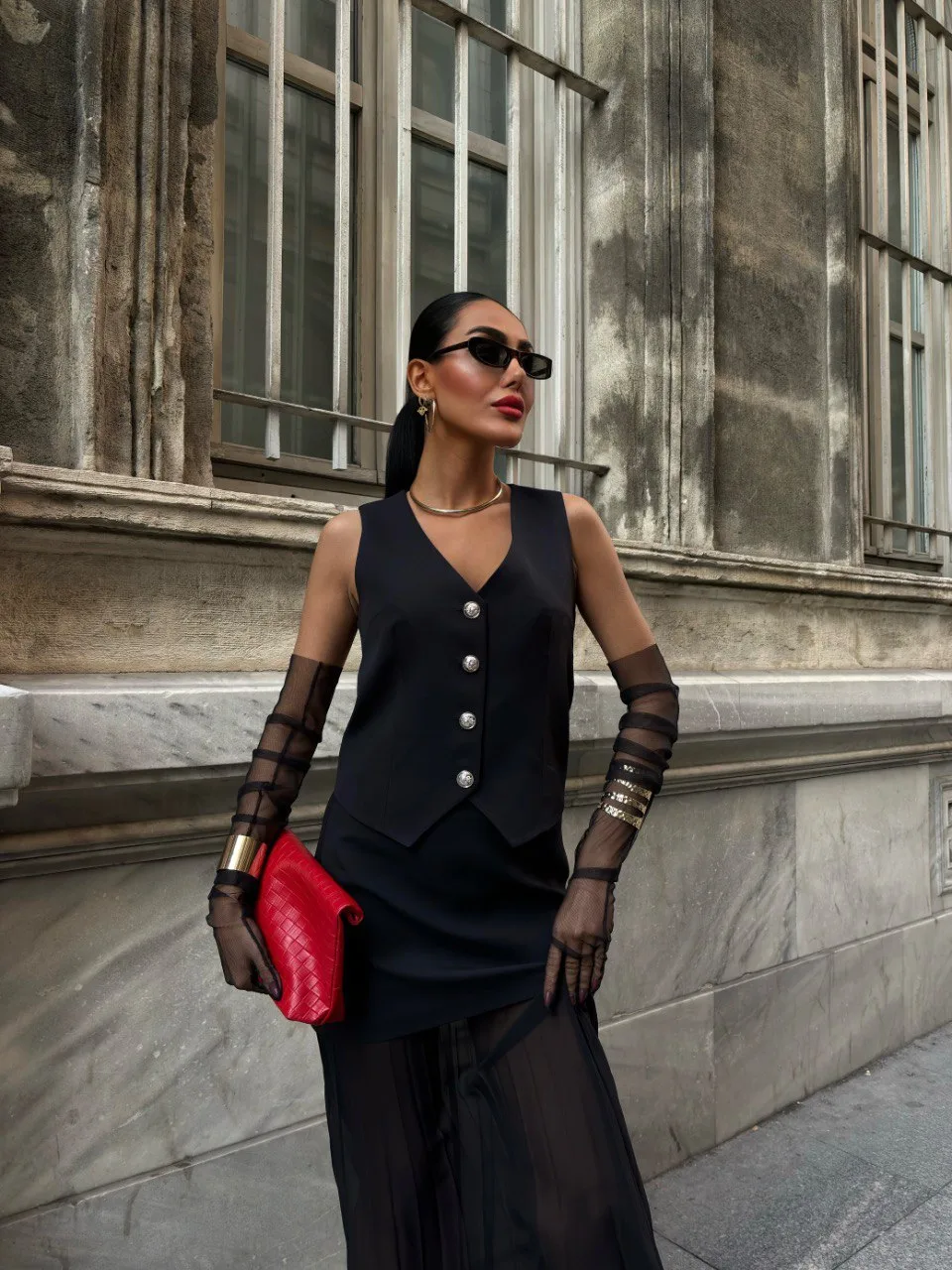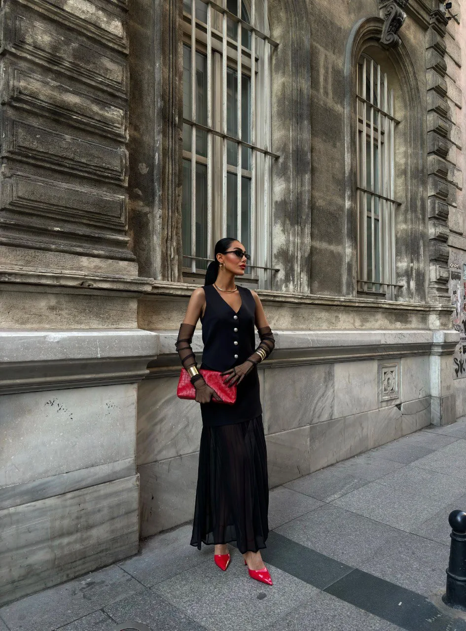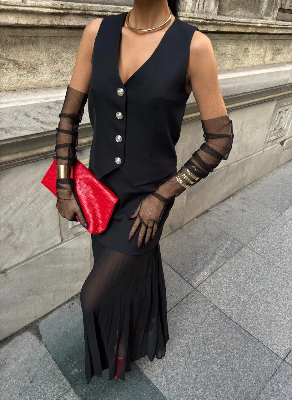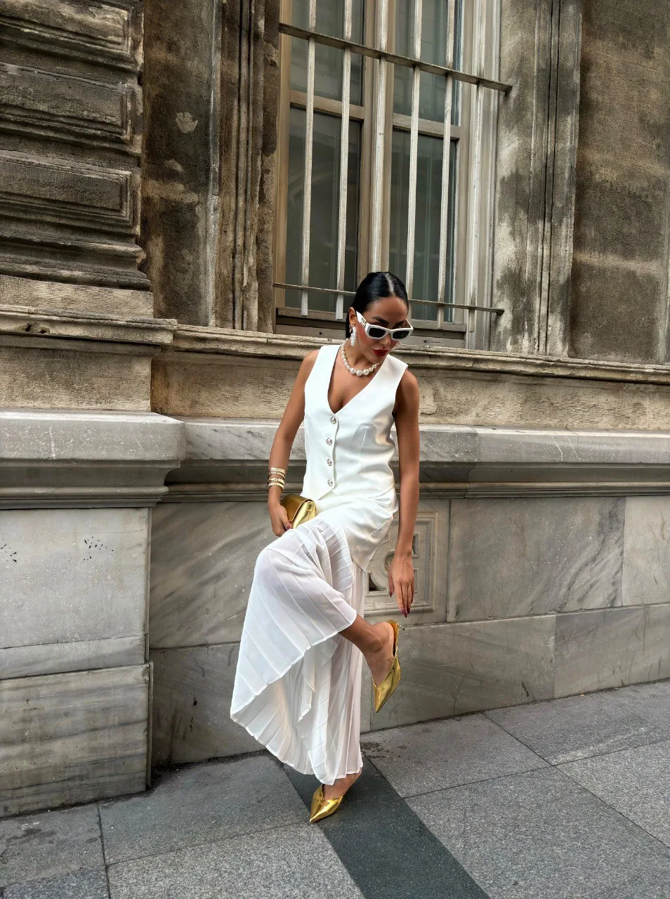 Комплетот е составен од елек и здолниште. Елекот има четири копчиња, има потстава. Здолништето во горниот дел е изработен од памук со ликра, а долниот дел изработен од жоржет кој е плисе со што го прави моделот уникатен.