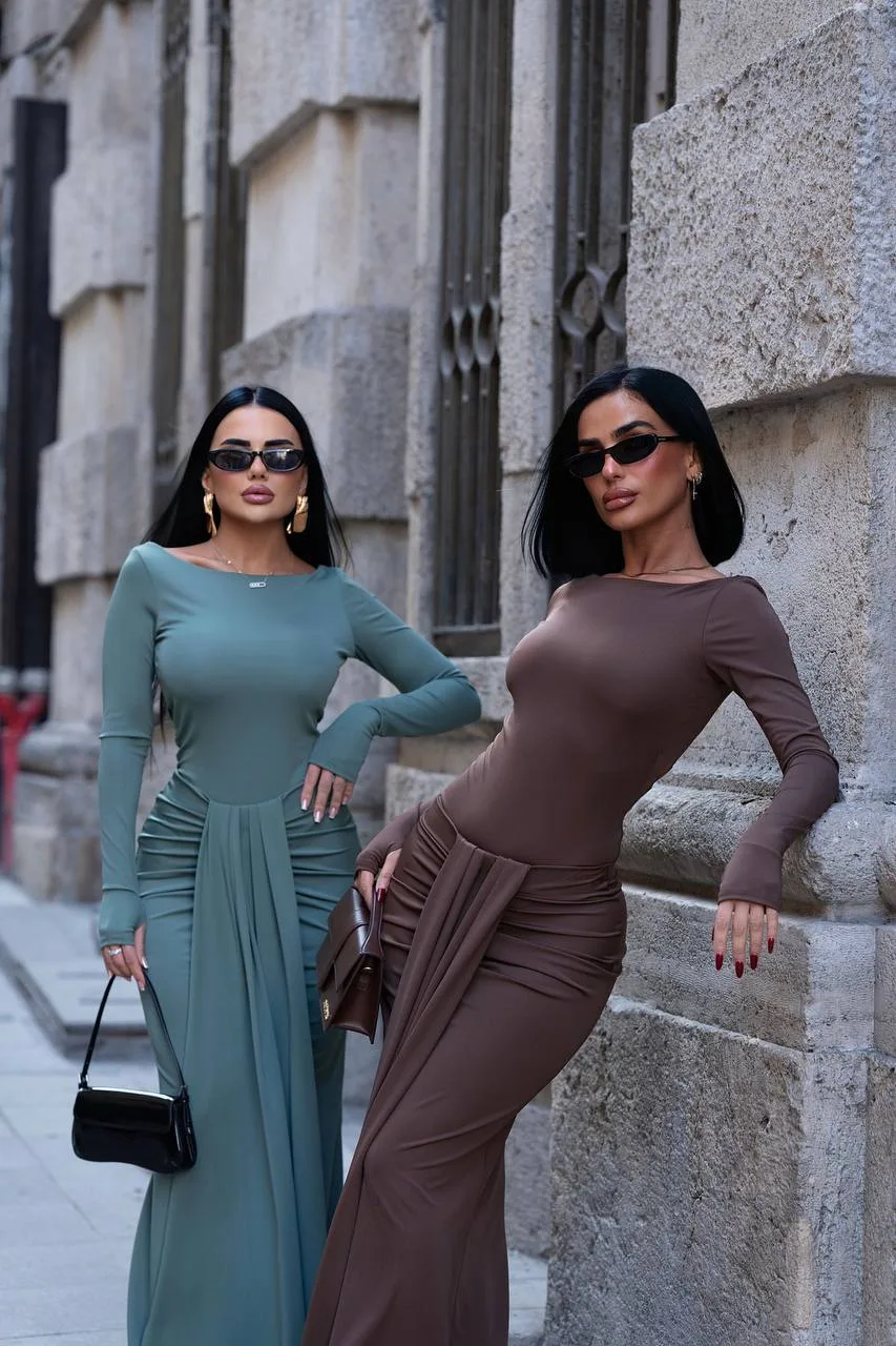 Моделот е дводелен ( боди како горен дел и долго здолниште како долен дел). Здолништето на предниот дел има дополнителен материјал, и е наберен со што ја истакнува линијата на телото.